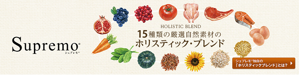 ドッグフード「シュプレモ」は、15種類の厳選自然素材のホリスティック・ブレンドによって、犬にとっての抜群の美味しさを引き出し、最適な栄養バランスを作り出したドッグフードです。
